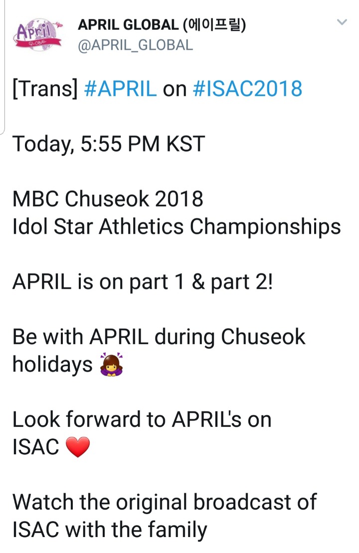 APRIL will make appearances on part 1 and 2 of the ISAC 2018, Chuseok Special.