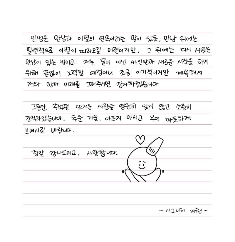 인생은 만남과 이별의 연속이라는 말이 있듯, 만남 뒤에는 필연적으로 이별이 따라오길 마련이지만 그 뒤에는 다시 새로운 만남이 있는 법이고, 저는 끝이 아닌 싸인팬과 새로운 시작을 하기 위해 끝없이 노력할 예정이니 조금 이기적이지만 계속해서 저와 함께 미래를 그려주시면 감사하겠습니다.