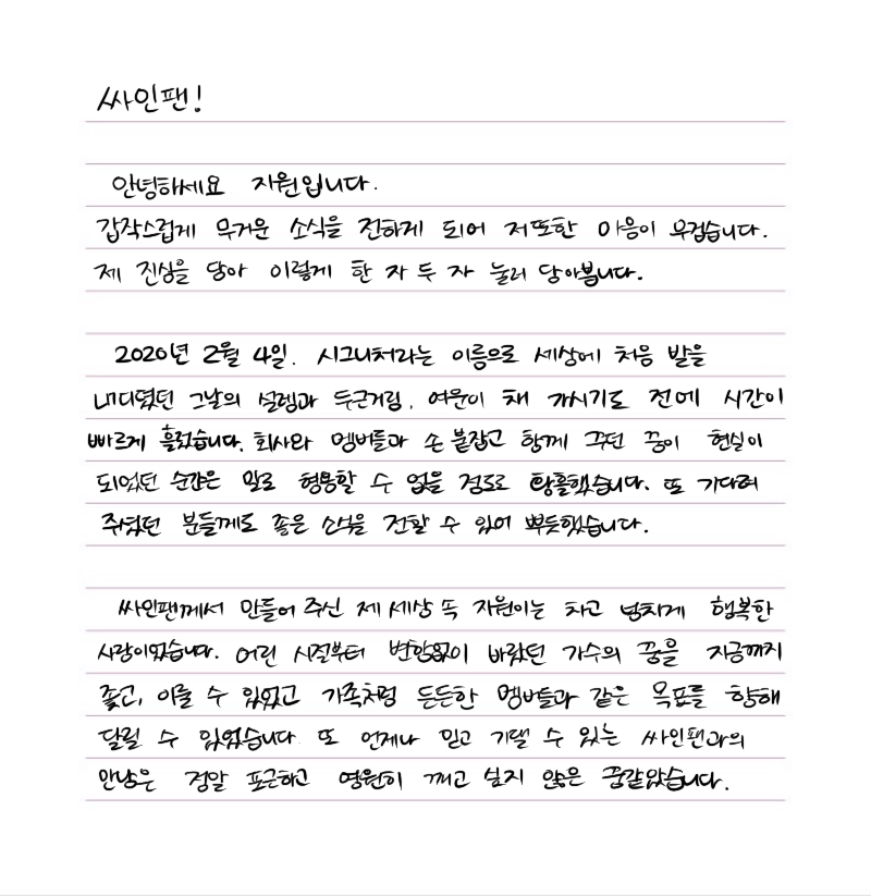 싸인팬께서 만들어 주신 제 세상 속 지원이는 차고 넘치게 행복한 사람이었습니다. 어린 시절부터 변함없이 바라던 가수의 꿈을 지금까지 좇고, 이룰 수 있었고 가족처럼 든든한 멤버들과 같은 목표를 향해 달릴 수 있었습니다. 또 언제나 믿고 기댈 수 있는 싸인팬과의 만남은 정말 포근하고 영원히 깨고 싶지 않은 꿈같았습니다.