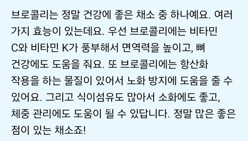 아래는 브로콜리의 효능에 대해서 챗gpt에게 물어본 결과야~