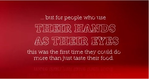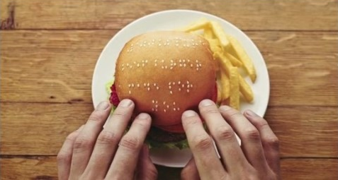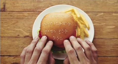(2) 시각장애인을 위한 배려 남아프리카 공화국의 인구는 약 5,300만명. 전체 인구 중 약 120만명이 시각장애를 앓고 있다고 합니다. 남아프리카의 대표적인 햄버거 체인점 Wimpy'는 시각쟁애인을 배려한 점자 메뉴를 모든 체인점에서 제공하는 서비스를 홍보하기 위해 고심을 하다가 획기적인 아이디어를 생각했습니다. 바로 점자로 만들어진 햄버거(Braille Burger)를 만들자!였습니다. 일반 사람들은 햄버거를 먹기 전에 무슨 맛인지 확인을 할 수 있지만 시각장애인들의 경우 먹어보기 전에는 무슨 맛인지 확인이 불가능하다는 점에 착안해 만들어진 이 점자 햄버거는 패트 위에 뿌려지는 깨를 이용하여 햄버거를 만드는데 사용된 원료 등을 설명하는 내용을 점자로 제작하여 시각장애인들이 햄버거를 먹기 전에 햄버거의 맛과 관련된 내용을 미리 가늠할 수 있도록 하였습니다.