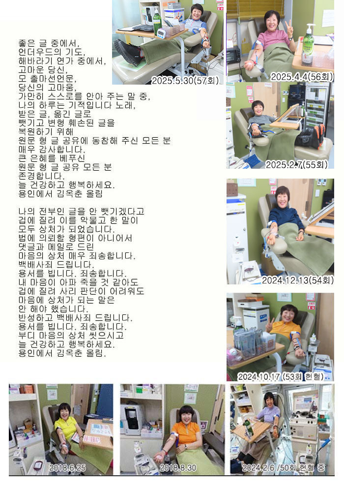| 사랑하는 방법 김옥춘 다리를 감고 도는 고양이가 무서웠던 어릴 때 기억이 뛰어오르는 개가 무서웠던 어릴 때 기억이 가끔 내게 말을 해. 친해지고 싶을 땐 사람에게도 동물에게도 해를 끼치지 않을 거라는 믿음을 먼저 주라고. 내가 옆에 있는 것이 안전하다는 걸 지금 다가가는 게 공격하는 게 아니라는 걸 보여주라고. 다가갈 땐 놀라지 않게 천천히 다가가야 하는 건가 봐. 나의 설렘보다 상대방의 정서적 안정이 먼저이어야 하나 봐. 믿음 없는데 달려들면 위험하다고 느낄 것 같아. 무섭다고 느낀 걸 싫어하는 감정이라고 생각할 것 같아. 어릴 때 나처럼. 배려하고 기다리면 어느새 서로 가까이 있겠지? 서로의 일상이 서로에게 위로와 격려가 되는 인생 친구가 되어 있겠지? 나. 가족, 이웃, 동료, 친구가 서로 믿을 수 있는 사람이었으면 좋겠어. 피해는 주지 않고 사랑하고 응원하는 아름다운 관계였으면 좋겠어. 내가 늘 응원하는 거 알지? 행복해지라고? 2021.10.5 | 억지로 웃기지 마세요 김옥춘 웃어야만 복이 오나요? 웃겨야만 돈이 되나요? 사람을 웃겨야만 돈이 되나요? 사람들이 웃어야만 당신 웃을 수 있나요? 개인 방송사인 일부 동영상 제작자님 일부 공영방송사 프로그램 제작과 운영자님 제발 제발 조심해주세요. 웃겨야 경쟁에서 이길 수 있다고 해도 생명과 사람 그리고 문화에 대한 비하의 말들이 포함돼 있는지 점검해야 합니다. 웃겨야 살아남을 수 있다고 해도 재미와 벌칙이라는 명목으로 가학적인 말과 행동이 남용되고 있는지 점검해야 합니다. 성장 과정에 있는 자녀들이 가학적인 말과 행동이 사람을 행복하게 웃게 한다고 믿게 하면 안 되는 거 알죠? 비하 발언과 예의 없음에 사람들은 열광하고 행복해한다고 믿게 하면 안 되는 거 알죠? 폭력과 가해가 아닌 올바름에 박수를 보내면서 진실과 사랑에 감동하며 웃는 내가 되겠습니다. 내 삶에 항상 우리 자녀들의 아름다운 성장을 위한 기도를 담겠습니다. 사랑합니다! 축복합니다! 2021.10.5 |