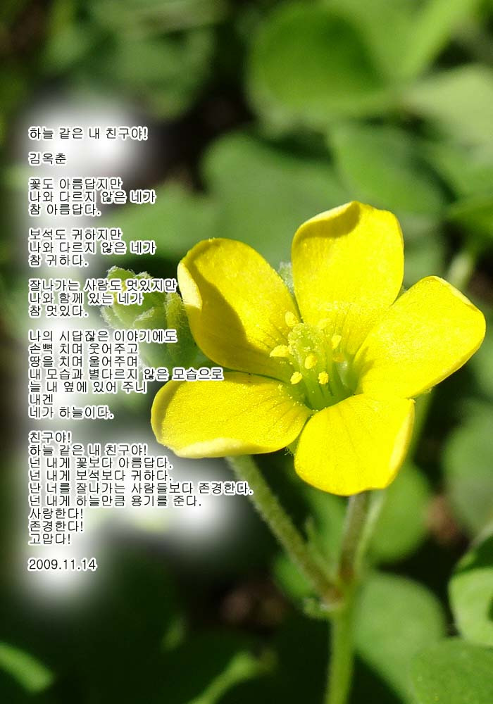 | 한로에 김옥춘 오늘이 찬 기운에 이슬이 맺힌다는 한로래. 참 빠르지? 이제 머지않아 이슬이 얼어 서리가 될 거래. 이제는 단풍이 매우 고울 거래. 추워지니까. 이제는 생존하기 위해 하는 식물들의 대비들이 세상을 매우 아름다운 빛으로 빛낼 거래. 이제는 동물들이 매우 부지런할 거래. 추워지니까. 이제는 생존하기 위해 하는 동물들의 식량 거두기와 보관이 매우 지혜로울 거래. 이제는 사람들이 주위를 매우 살필 거래. 추워지니까. 이제는 사람들의 식량과 온기 나눔이 매우 감동적일 거래. 놀랍지? 감동이지? 감동이야! 감동이 함께하는 우리들의 하루하루 축복해! 2020.10.8 | 한글날에 김옥춘 태극기를 달았습니다. 한글을 만들어 세상에 펴낸 날을 기념하고 한글의 우수성을 기리는 날 한글날입니다. 소리글 한글을 만들어내고 누구나 한글을 쓰고 읽을 수 있도록 지혜와 힘을 보탠 역사 속의 모든 분 고맙습니다. 오늘은 아침 인사를 하늘로 먼저 보냅니다. 오늘 얼른 태극기를 달았습니다. 민족의 위상을 곧 세우고 민족의 위엄을 곧 세운 한글의 태어남 축하합니다. 국민의 행복을 만들고 국민의 힘을 키운 한글의 성장과 발전 고맙습니다. 대한민국 국민의 한글 사랑과 한글 지킴과 한글 성장시킴을 오늘 자랑합니다. 응원합니다. 사랑합니다. 아름다운 한글 훌륭한 한글 한글로 가득한 나의 하루 2020.10.9 |