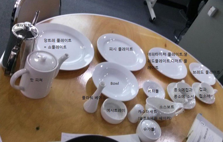 *브레드 앤 버터 플레이트- 빵만 담으면 브레드 플레이트 *애피타이저 플레이트(발음은 애퍼타이저) * 피시 플레이트- 두 번째 크기 접시 * 앙트레 플레이트: (=쇼 플레이트) 주로 스테이크를 담음 *볼: 밑이 둥금 * Hot pitcher: 홍차 녹차 더운물 * 워터 피쳐: 찬물 물