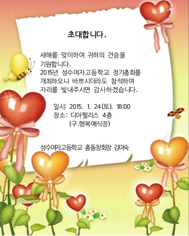 2015년 총회에 초청합니다. 작성자총동창회장 김미숙(9회)|작성시간15.01.21|조회수71 목록 댓글 0 글자크기 작게가 글자크기 크게가 동문들은 오후 5시 까지 오시면 됩니다. 다음검색 현재 게시글 추가 기능 열기 북마크 공유하기 신고 센터로 신고 댓글 댓글 0 댓글쓰기 답글쓰기 댓글 리스트