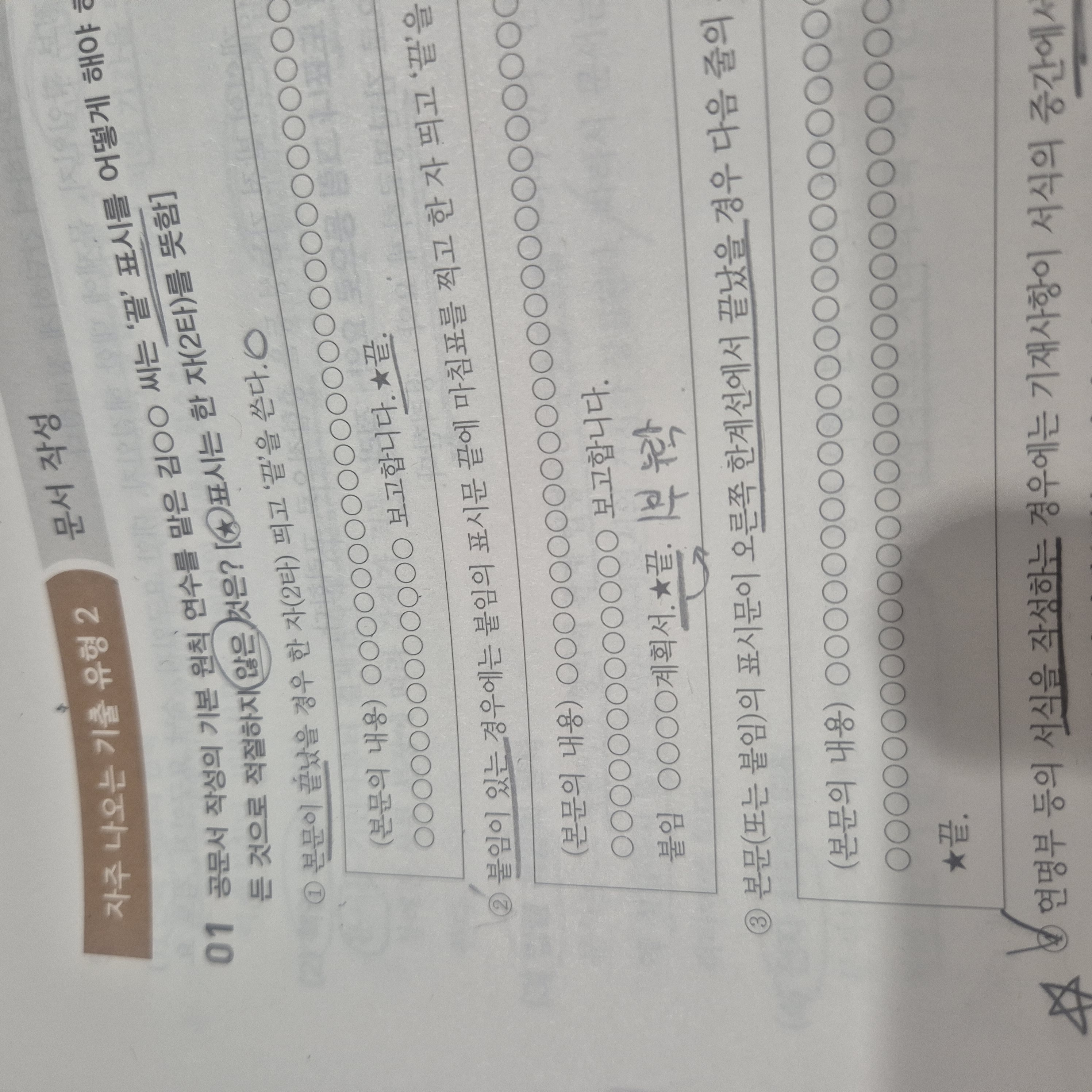 시대에듀 p.68.1번 문제 보기2번 작성자실용글쓰기-정승주|작성시간26.03.24|조회수52 목록 댓글 2 글자크기 작게가 글자크기 크게가 시대에듀 p.68 입니다2번 보기에서 붙임 뒤 '계획서 1부. 끝.'라고 해야지 정답 아닌가요? 무조건 1부 안붙여도 되나요?? 다음검색 현재 게시글 추가 기능 열기 북마크 공유하기 신고 센터로 신고 댓글 댓글 2 댓글쓰기 답글쓰기 댓글 리스트 작성자국어강사 오선희 | 작성시간 26.03.24 '1부'라고 해야 합니다. 이 교재에서 ② 같은 경우는 붙임 다음에 '끝' 표시를 한다는 것을 보여 주는 것에 초점을 맞추느라 누락한 것 같아요.'행정운영편람'에는 '1부'가 다 쓰여 있습니다. '1부'라고 쓰는 게 맞아요! 답댓글 작성자실용글쓰기-정승주 작성자 본인 여부 작성자 | 작성시간 26.03.24 감사합니다^^! 댓글 전체보기
