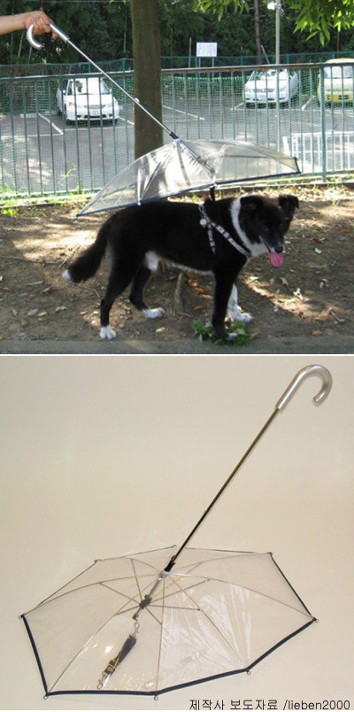 투명 우산을 결합한 형태. 애견이 비에 젖는 것을 막으면서도 눈으로 보면서 통제도 할 수 있도록 되어 있다. 애견과의 우중산책을