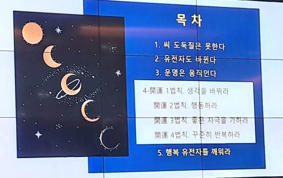 또한 배 실장은 “사람들은 환난에 처하면 운명이나 팔자타령을 한다”면서 “숙명은 부모, 형제, 출생지는 태어날 때부터 정해진 것이어서 바꿀 수가 없지만, 운명의 ‘운(運)’은 ‘움직이다’, ‘운용하다’라는 뜻으로, “이미 발생하여 바꿀 수 없는 상황에 부딪혔을지라도, 어떠한 태도를 취하느냐에 따라 고난이 되기도 하고 성공의 밑거름이 되기도 한다고, ‘운명의 주인이 되라’는 주제로 ▲씨 도둑질은 못한다. ▲유전자도 바뀐다. ▲운명은 움직인다. ▲생각을 바꿔라, 행동하라, 좋은 자극을 가하라, 꾸준히 반복하라. ▲행복 유전자를 깨워라.”는 목차를 조목조목 나열하여 강의하면서, “진화생물학자 리처드 도킨스의 ‘이기적 유전자’에 대해서도 언급했다.