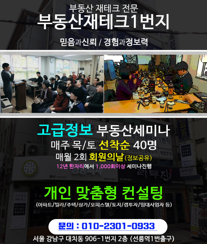 ★부동산 투자 전략 세미나★ =10월 12일 (토) 오후 12:30~14:30(동호회회원 정기모임의 날= 회원만 참석 가능, 당일까지 가입하신 분들은 참석가능) =10월 17일 (목) 오후 2~4시(누구나 참석 가능) =10월 19일 (토) 오후 12:30~14:30(누구나 참석 가능) =선착순 60명 무료.. 사전예약제.. =세미나 후 무료상담 혜택 (세미나 예약시 함께 예약) =강남구 대치동 906-1번지 2층 (선릉역1번출구) =예약 : 010-2301-0933 (성함과 날짜를 문자 또는 전화로 말씀해주세요) |