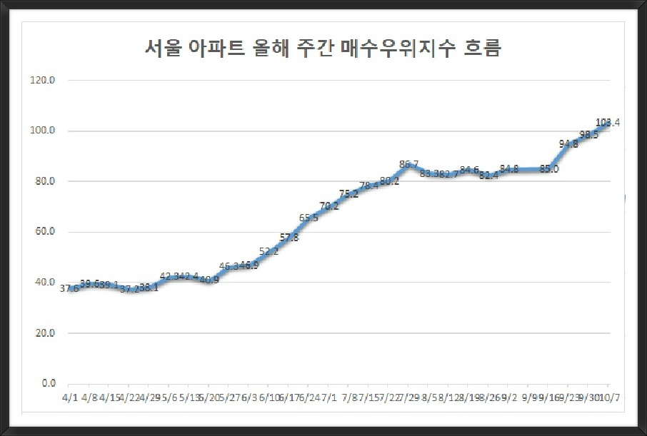 매수우위지수가 100을 넘었다는 것은 매수자들이 매도자보다 더 많아 졌다는 의미다. 집을 사겠다는 사람들이 많아졌기 때문에 매도자들이 매수자를 선택할 수 있는 ‘매도자 우위’ 시장으로 변화했다는 뜻이다.