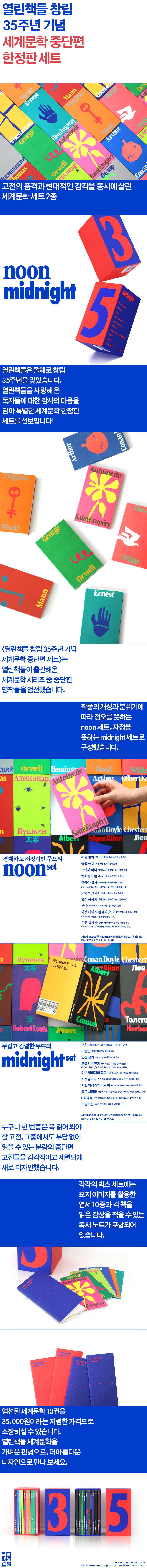 특별히 작품의 개성과 분위기에 따라 '정오'를 뜻하는 『NOON 세트』와 '자정'을 뜻하는 『MIDNIGHT 세트』로 구성하여, 독자들이 취향에 맞게 고를 수 있도록 하였다.