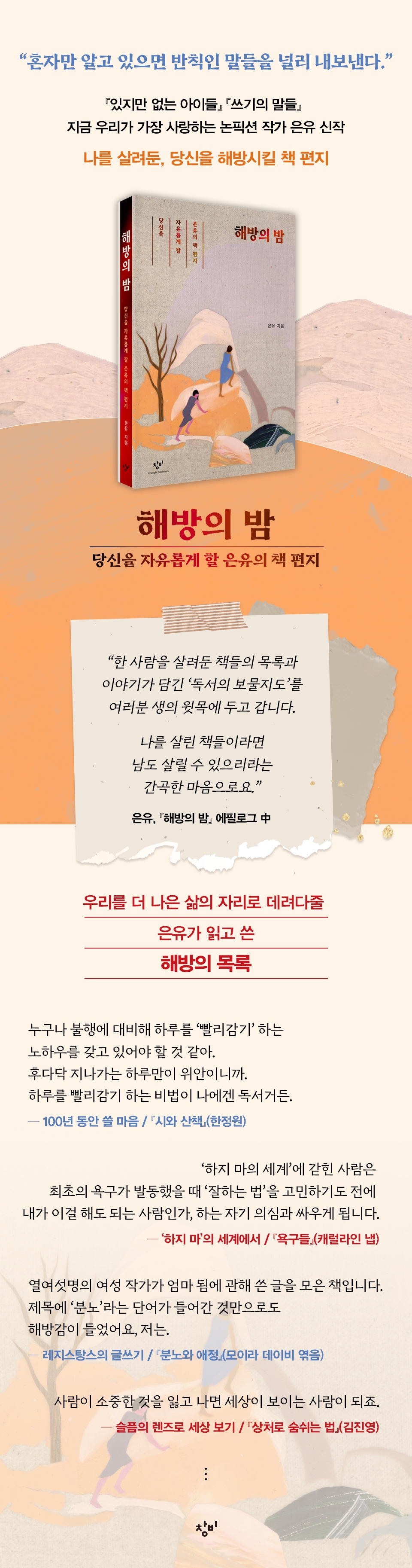 르포르타주, 인터뷰, 에세이 등 다양한 분야의 글쓰기를 통해 ‘믿고 읽는 작가’로 자리잡은 은유가 5년 만에 산문집을 펴낸다. 신작 『해방의 밤』은 어느덧 ‘중견 작가’라 불리지만 ‘나는 가운데(中)도, 굳어지는 것(堅)도 싫다’고 말하는 저자가 중심에 함몰되지 않기 위해, 굳어가지 않기 위해 부단히 해온 수련의 기록이기도 하다. 가장 내밀한 곳에 새겨왔던 문장들부터 자신을 살린 책까지 ‘혼자만 알면 반칙인 말들’을 은유만의 감각과 시선으로 나눈다.