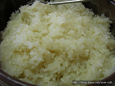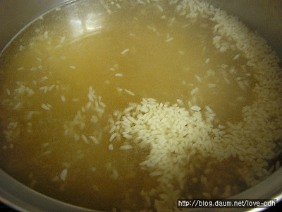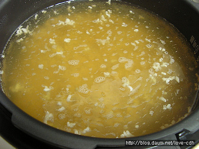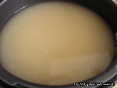 3.고들 고들한 찹쌀밥에 1번의 윗물만 쭈-욱 따라주세요.따르고 나면 바닥에 하얀색이 가라앉아있어요.그건 그냥 버려주심 된답니다.물의 양은 원하시는데로 조절하세요.밥의 양두요~^^