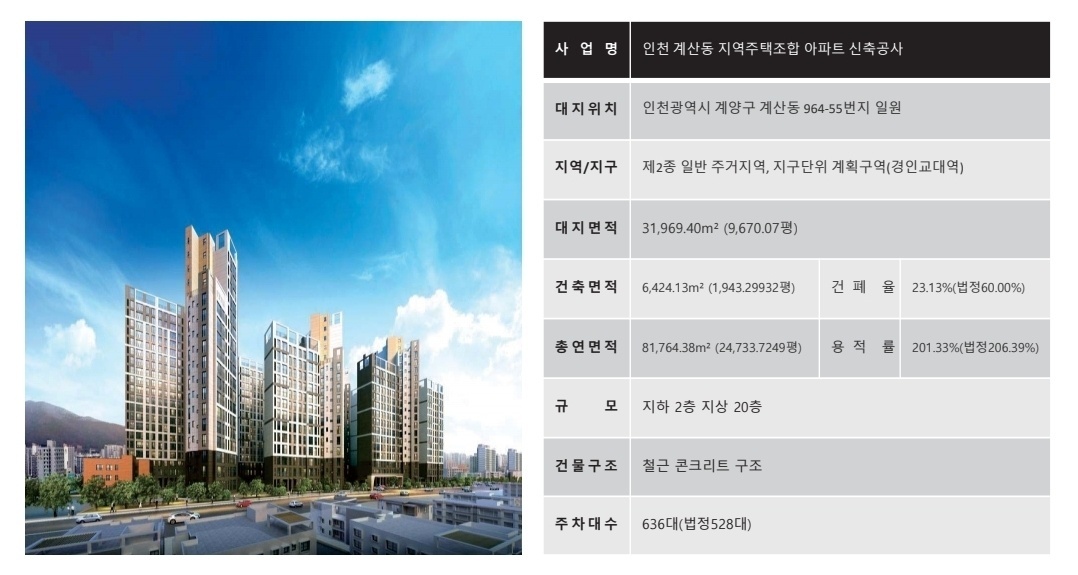 #계양하늘채더퍼스티 아파트 단지는 인천광역시 계양구 계산동 964-55번지 일원에 건축되며 지하 2층~지상 20층, 9개 동, 전용면적 59~84㎡의 중소형 평형대, 총 526세대 규모의 지역주택조합 아파트로 조성됩니다. 주차 대수는 총 636대로 법정 528대보다 많은 주차 시설이 마련됩니다.