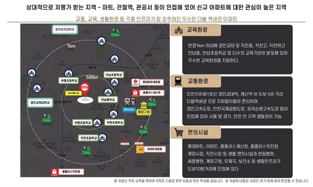 계양 하늘채 더퍼스트 단지 도보 거리에는 부평초, 부헌초, 안남초, 작전초를 비롯해 인천안남중, 계산여중, 작전중, 작전고, 작전여고 등 보도로 통학이 가능한 학군들로 밀집돼 있으며, 경인교대 인천캠퍼스와 경인여대가 인접해 있어 다양하고 우수한 교육 환경을 갖추고 있습니다. 더불어 단지 인근으로 계산 전통시장, 롯데마트, 홈플러스, CGV 계양점, 아이즈빌 아울렛, 계양구청, 인천 세종병원 등 풍부한 생활 인프라도 갖추고 있어 편리한 생활을 할 수 있습니다.