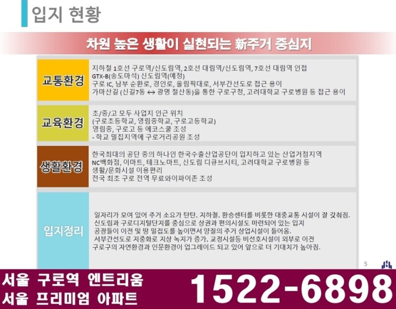 ■ 교통장점: GTX-B노선 (송도마석 2022년) 신도림역이 예정에 있으며, 구로IC, 남부 순환로, 경인로, 올림픽대로, 서부간선도로로의 접근 용이