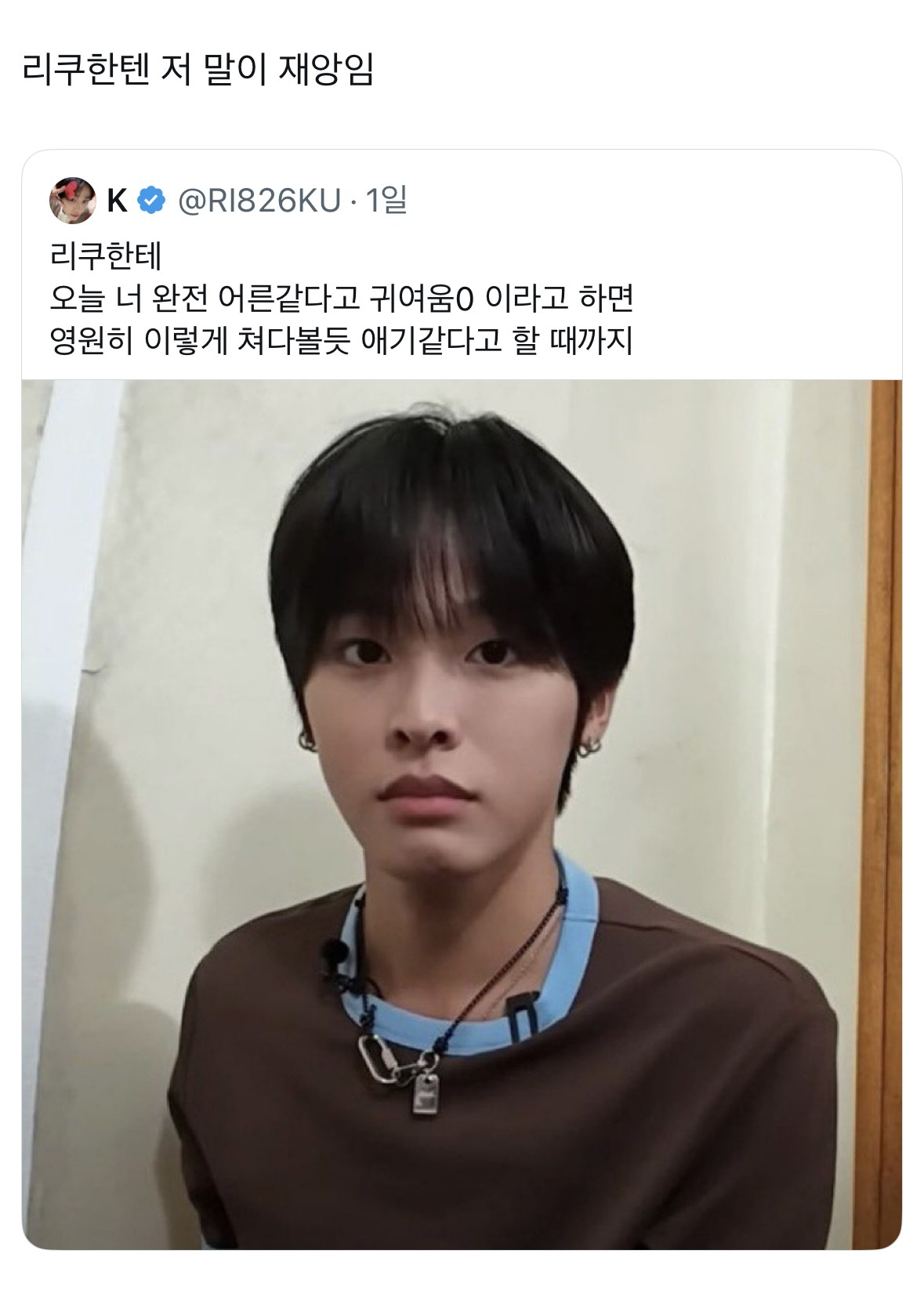 아 리쿠 진쯔 개웃긴다 작성자JB|작성시간25.12.29|조회수2,260 목록 댓글 12 글자크기 작게가 글자크기 크게가 https://x.com/myr1ku/status/2005601765857898536?s=46X의 마루님(@myr1ku)🐿️ 내가 만약에 위시에서 막내였으면 아마 유우시도 나를 귀여워해줬고 사쿠야도 귀여워해줄걸 … 막내할까 그냥? 회사한테 말할까 나이를 좀.. ㅅㅂ 진짜 그만 웃기셈x.comㅋㅋㅋㅋㅋㅋㅋㅋㅋㅋㅋㅋㅋ 나이를 왴ㅋㅋㅋㅋㅋ 다음검색 현재 게시글 추가 기능 열기 북마크 신고 센터로 신고 댓글 댓글 12 댓글쓰기 답글쓰기 댓글 리스트 작성자JB | 작성시간 25.12.29 귀야어 작성자JB | 작성시간 25.12.29 존나 귀여워ㅋㅋㅋㅋㅋㅋㅋ 작성자JB | 작성시간 25.12.29 회사한테 말하면 뭐가 달라지냐고 작성자JB | 작성시간 25.12.29 오늘 라방 지짜 다귀여움 ㅠㅠ 작성자JB | 작성시간 25.12.30 하진짜 개웃겨 아 이런남자 첨봄 댓글 전체보기