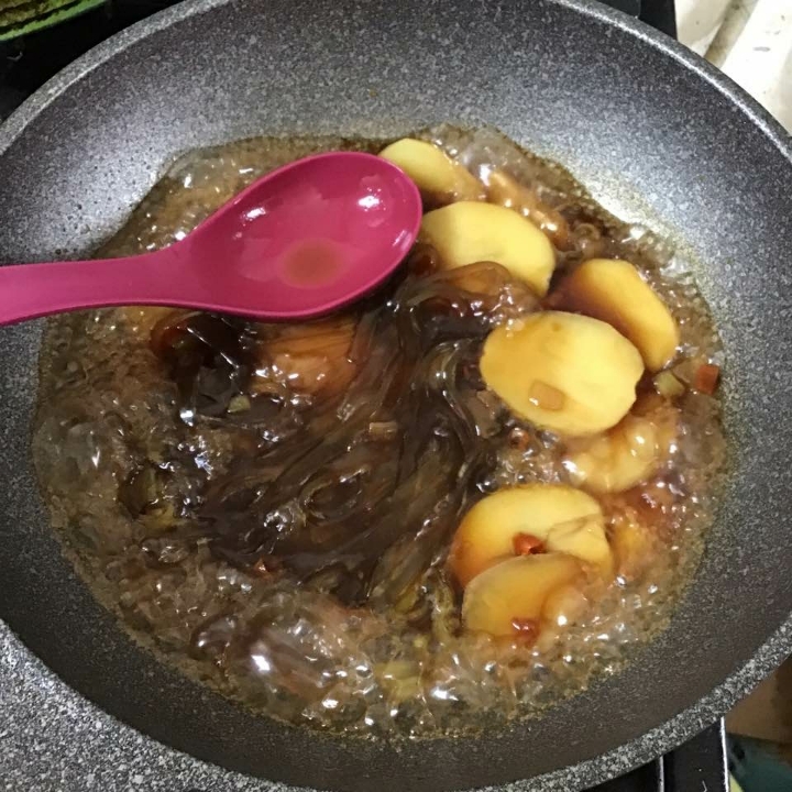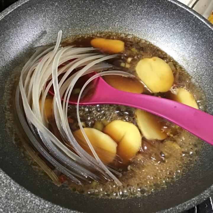 5. 감자가 연한 갈색빛이 돌면 불린 당면을 넣어주세요