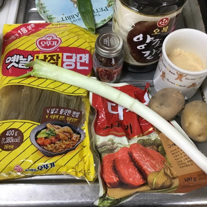 준비물: 당면, 간장, 설탕, 조미료, 감자, 대파, 고추