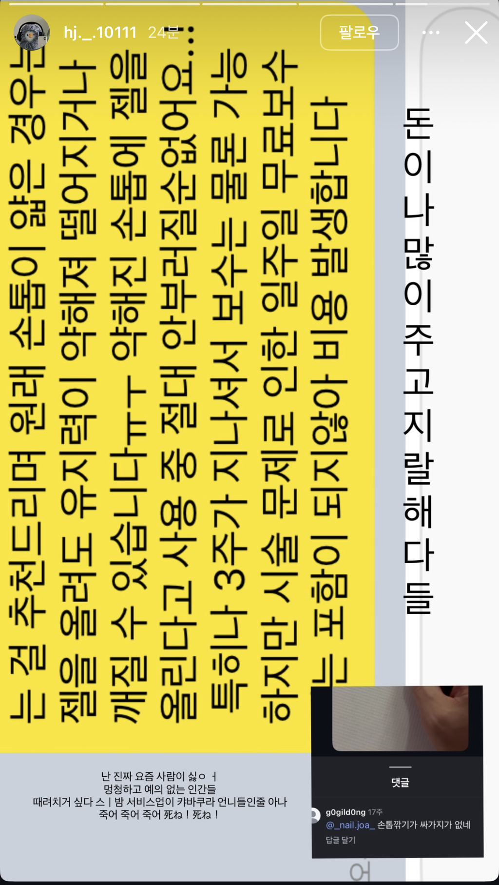 [스크랩] 개무서운 네일샵 사장 작성자JB|작성시간26.03.29|조회수362 목록 댓글 4 글자크기 작게가 글자크기 크게가 네일샵 고객들 다 뒤지래! 다음검색 스크랩 원문 : 쭉빵카페 현재 게시글 추가 기능 열기 북마크 신고 센터로 신고 댓글 댓글 4 댓글쓰기 답글쓰기 댓글 리스트 작성자JB 작성자 본인 여부 작성자 | 작성시간 26.03.29 인천 구월동에 있음 해당 댓글은 작성자와 운영진만 볼 수 있습니다. 해당 댓글은 작성자와 운영진만 볼 수 있습니다. 작성자JB | 작성시간 26.03.29 ?,, 댓글 전체보기