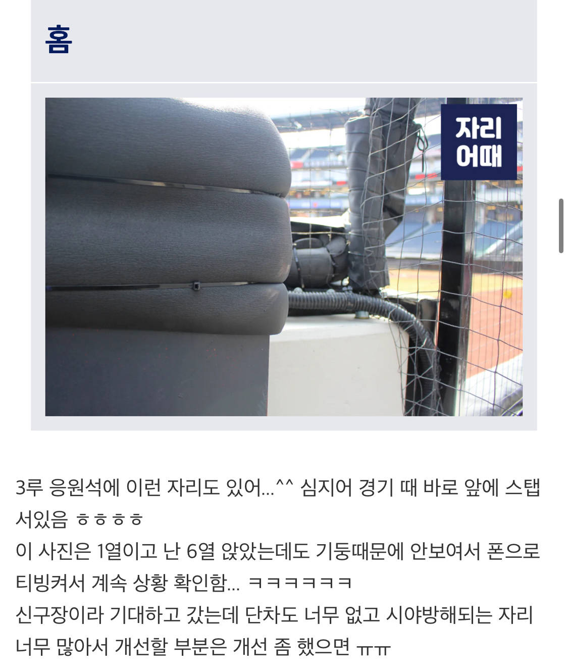 쭉빵카페 한화 볼파크 시야방해석 아닌데 시야방해 이슈 작성시간25.05.06|조회수3,595 목록 댓글 42 글자크기 작게가 글자크기 크게가 설계부터 이상한거면 대체 어떻게 뜯어고쳐야 되는 거임…?https://theqoo.net/hot/3723972187 +댓글 다음검색 현재 게시글 추가 기능 열기 북마크 신고 센터로 신고 댓글 42 댓글 리스트 작성시간 25.05.06 장애인석 ㅈㄴ 이상하게 만들어둔 것부터 별로였어 답댓글 작성시간 25.05.06 ㄹㅇ 이게 개에바임 장난하나 작성시간 25.05.06 엥....? 오바야 작성시간 25.05.06 에바다 작성시간 25.05.06 엥..ㅁㅊ 카페 방문해 더 많은 댓글 만나기!