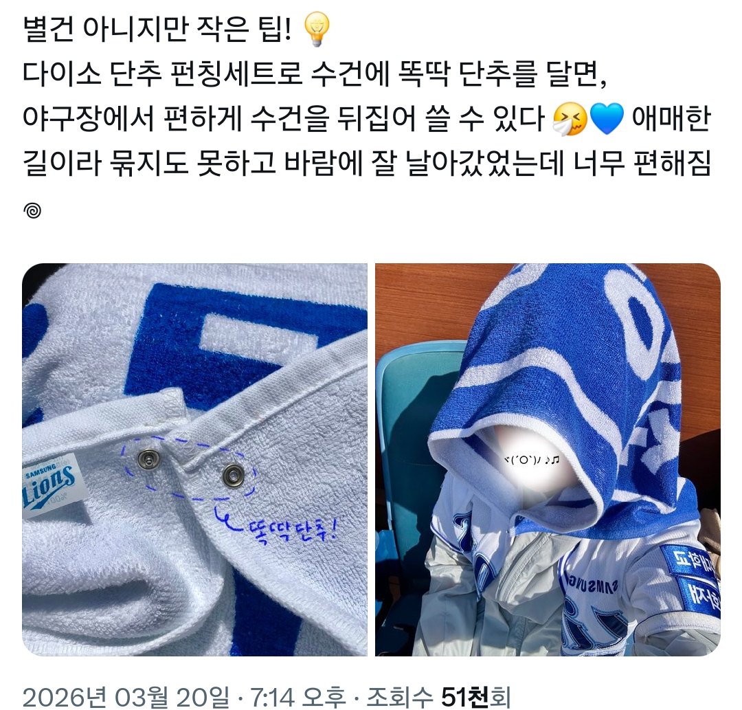 와 이사람 가방끈 레전드 작성자JB|작성시간26.03.20|조회수16,090 목록 댓글 26 글자크기 작게가 글자크기 크게가 https://x.com/i/status/2034936593593901302X의 yun님(@yuuunluv)별건 아니지만 작은 팁! 💡 다이소 단추 펀칭세트로 수건에 똑딱 단추를 달면, 야구장에서 편하게 수건을 뒤집어 쓸 수 있다 🤧💙 애매한 길이라 묶지도 못하고 바람에 잘 날아갔었는데 너무 x.com미쳤다 다음검색 현재 게시글 추가 기능 열기 북마크 신고 센터로 신고 댓글 댓글 26 댓글쓰기 답글쓰기 댓글 리스트 작성자JB | 작성시간 26.03.20 개천재 작성자JB | 작성시간 26.03.20 나 이거 보고 내일 바로 다이소갈라고 작성자JB | 작성시간 26.03.20 ㅁㅊ천재 작성자JB | 작성시간 26.03.21 헐 배운 사람이다 작성자JB | 작성시간 26.03.21 와 ㅁㅊ 댓글 전체보기