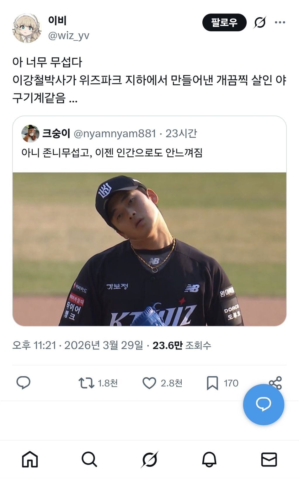 개웃기다 진짜 작성자JB|작성시간26.03.30|조회수673 목록 댓글 3 글자크기 작게가 글자크기 크게가 ㅋㅋㅋㅋㅋ 다음검색 현재 게시글 추가 기능 열기 북마크 신고 센터로 신고 댓글 댓글 3 댓글쓰기 답글쓰기 댓글 리스트 작성자JB | 작성시간 26.03.30 인간으로 안 느껴지긴 함 답댓글 작성자JB 작성자 본인 여부 작성자 | 작성시간 26.03.30 그렇긴해..인용이 웃긴것뿐 작성자JB | 작성시간 26.03.30 아카잡는기계 댓글 전체보기