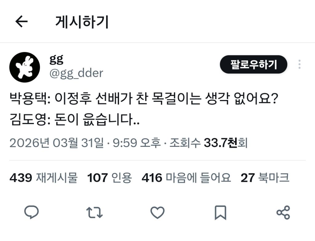 돈이 읎습니다.. 작성자JB|작성시간26.03.31|조회수1,673 목록 댓글 13 글자크기 작게가 글자크기 크게가 https://x.com/i/status/2038964437168857345X의 gg님(@gg_dder)박용택: 이정후 선배가 찬 목걸이는 생각 없어요? 김도영: 돈이 읎습니다..x.com 다음검색 현재 게시글 추가 기능 열기 북마크 신고 센터로 신고 댓글 댓글 13 댓글쓰기 답글쓰기 댓글 리스트 작성자JB | 작성시간 26.03.31 통장 까봐요 작성자JB | 작성시간 26.03.31 구라 통장에 돈이 계속 들어온다며 작성자JB | 작성시간 26.03.31 기만 작성자JB | 작성시간 26.03.31 진짜 그지가 뭔지 보여주자 작성자JB | 작성시간 26.03.31 ㅉㅉ난 만원이나 있는데ㅋㅋ 불쌍하니까 내통장이랑 바꿔줄게 니통장줘 댓글 전체보기