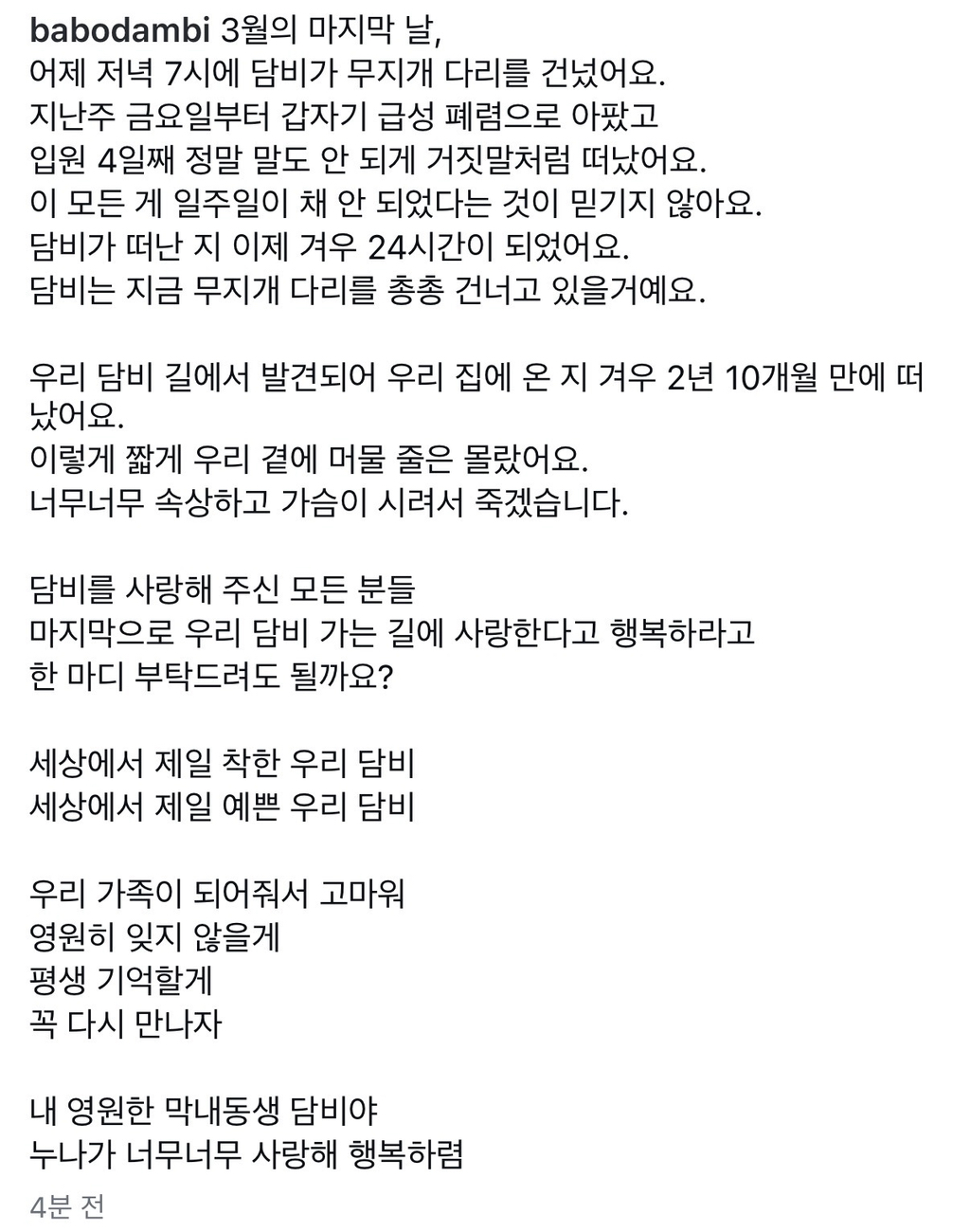 ㅇㅇㅇ 재롱이네 둘째 담비 무지개다리 건넜대 ㅠㅠㅠㅠㅠ 작성자JB|작성시간26.04.01|조회수3,110 목록 댓글 19 글자크기 작게가 글자크기 크게가 너무 갑자기라 충격임 아 ㅠㅠㅠ 담비야 다음검색 현재 게시글 추가 기능 열기 북마크 신고 센터로 신고 댓글 댓글 19 댓글쓰기 답글쓰기 댓글 리스트 작성자JB | 작성시간 26.04.01 헐.. 작성자JB | 작성시간 26.04.01 와 말도안돼… 작성자JB | 작성시간 26.04.01 헐.. 말도안돼 작성자JB | 작성시간 26.04.01 헐.. 작성자JB | 작성시간 26.04.01 안돼.. 댓글 전체보기