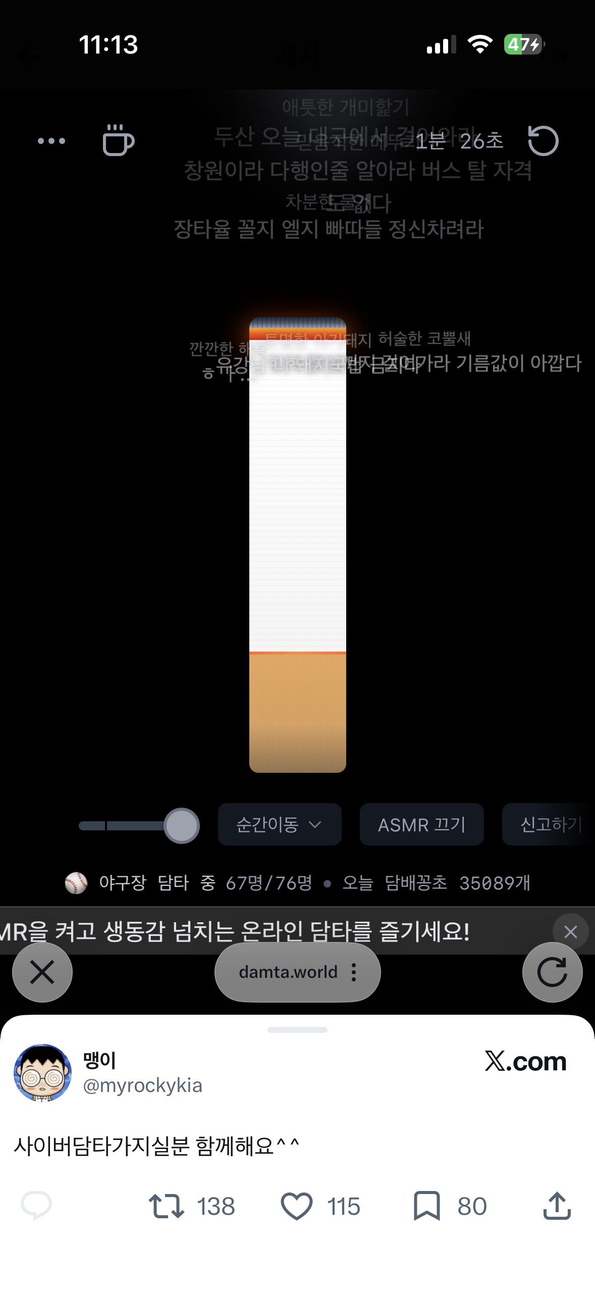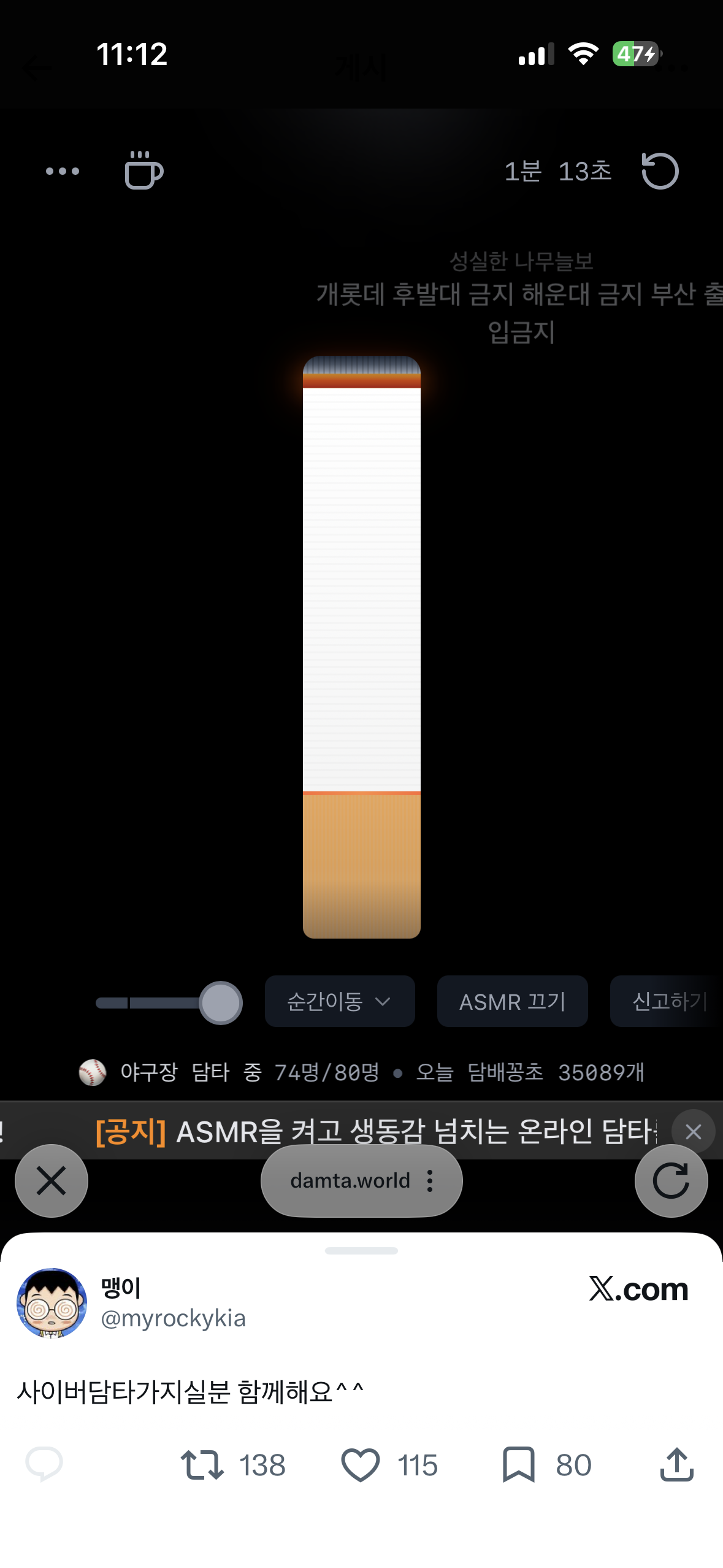 사이버담타중 작성자JB|작성시간26.04.02|조회수433 목록 댓글 1 글자크기 작게가 글자크기 크게가 https://x.com/myrockykia/status/2039669439311053031?s=46X의 맹이님(@myrockykia)사이버담타가지실분 함께해요^^ https://t.co/2qrEH9iMe6x.comㄱㄱ 다음검색 현재 게시글 추가 기능 열기 북마크 신고 센터로 신고 댓글 댓글 1 댓글쓰기 답글쓰기 댓글 리스트 작성자JB | 작성시간 26.04.02 ㅋㅋㅋㅋㅋㅋㅋㅋㅋㅋㅋ아 저기 댓글머임? 한화니기럴스 잠실까지 걸어가셈ㅋㅋㅋㅋ 댓글 전체보기