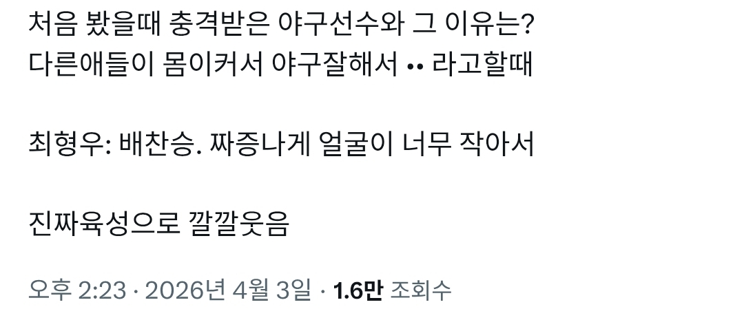 최형우 얼굴크기정병잇네(아님) 작성자JB|작성시간26.04.04|조회수526 목록 댓글 1 글자크기 작게가 글자크기 크게가 다음검색 현재 게시글 추가 기능 열기 북마크 신고 센터로 신고 댓글 댓글 1 댓글쓰기 답글쓰기 댓글 리스트 작성자JB | 작성시간 26.04.04 ㅅㅂㅋㅋㅋㅋㅋㅋㅋㅋㅋㅋ원래 아저씨들이 외모정병 더 심함 댓글 전체보기