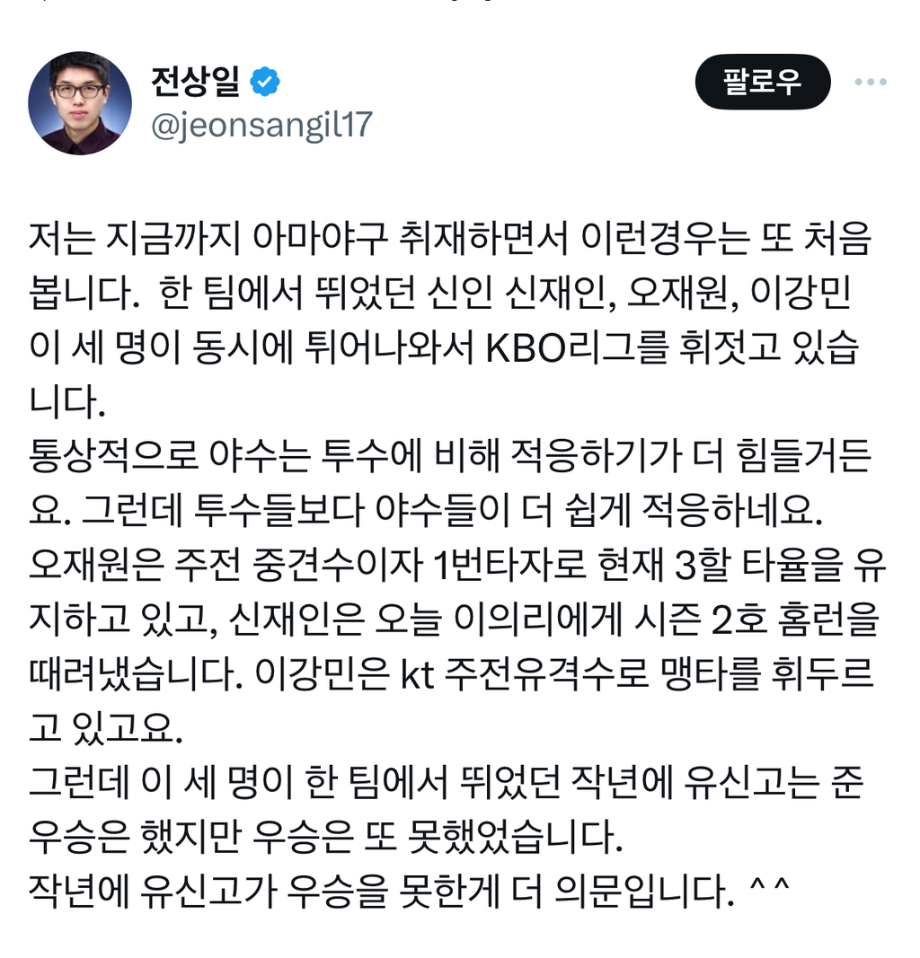 이 세 명이 한 팀에서 뛰었던 작년에 유신고는 준우승은 했지만 우승은 또 못했었습니다. 작성자JB|작성시간26.04.04|조회수455 목록 댓글 3 글자크기 작게가 글자크기 크게가 다음검색 현재 게시글 추가 기능 열기 북마크 신고 센터로 신고 댓글 댓글 3 댓글쓰기 답글쓰기 댓글 리스트 작성자JB | 작성시간 26.04.04 투수가 못했나 작성자JB | 작성시간 26.04.04 우승은 어디엿어? 답댓글 작성자JB 작성자 본인 여부 작성자 | 작성시간 26.04.04 경남고라는듯 댓글 전체보기