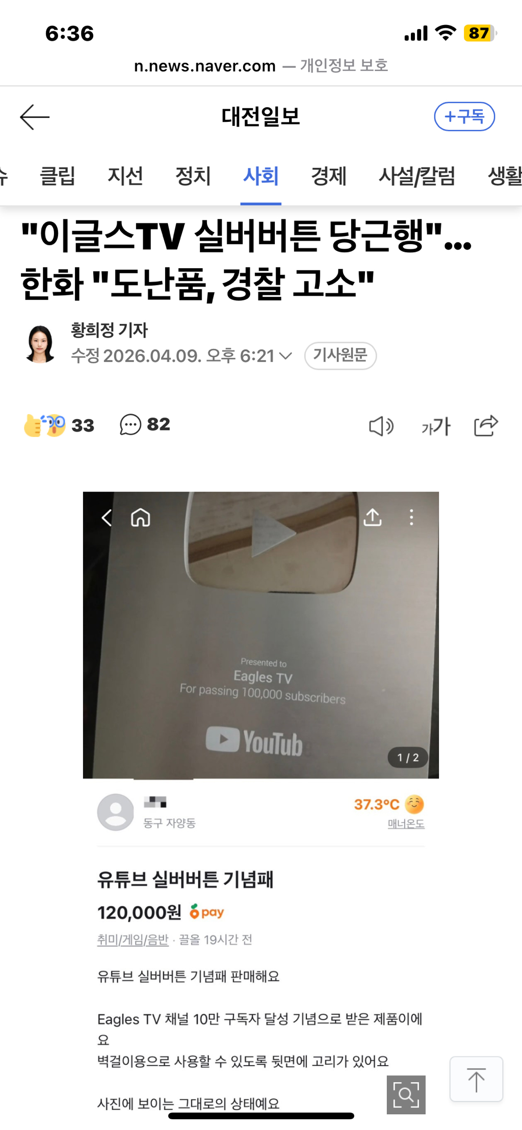 누가 가짜인 것 같다 했는데 실제 도난 당한거고 실버 버튼 3개 중에 하나가 당근마켓에 올라온 거래..구 구장(이글스파크)에 전시용으로 사용하던 물품으로, 신구장 이전 과정에서 분실된 것으로 확인됐대