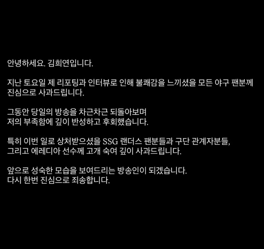 김희연 리포터 사과문 작성자JB|작성시간26.04.09|조회수1,335 목록 댓글 7 글자크기 작게가 글자크기 크게가 인스스랑 게시물에 둘다 올리심방송사는 왜 리포터 뒤에 숨어계시는지 다음검색 현재 게시글 추가 기능 열기 북마크 신고 센터로 신고 댓글 댓글 7 댓글쓰기 답글쓰기 댓글 리스트 작성자JB | 작성시간 26.04.09 혼자 기획한 것도 아닐텐데 다 뒤집어 쓰네; 작성자JB | 작성시간 26.04.09 대본일텐데 방송사는 뒤에서 뭐하냐ㅋㅋㅋ 작성자JB | 작성시간 26.04.09 아니 개저들이 여자 뒤에 숨어서ㅅㅂ 작성자JB | 작성시간 26.04.09 아니 리포터만 계속 사과하고 다니는게 맞는거임? 작성자JB | 작성시간 26.04.09 에휴 댓글 전체보기
