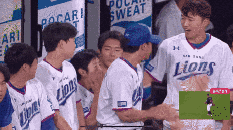 일단 점수 내기 전에 꽃게쇼로 얼라 웃겨주는 강민호(전 주장, 당시 36세)