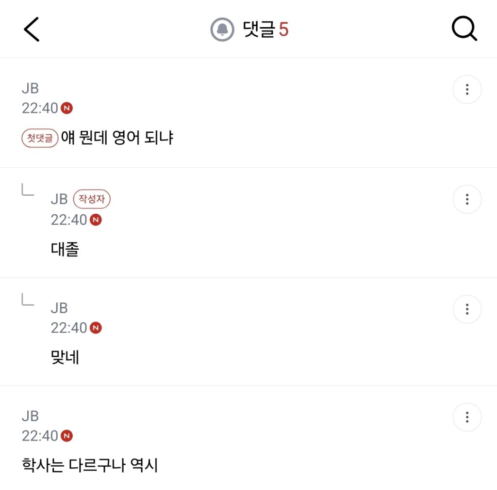 얘 뭔데 영어 되냐 > 대졸 > 학사는 다르구나 역시 작성자JB|작성시간26.04.10|조회수497 목록 댓글 2 글자크기 작게가 글자크기 크게가 이 흐름이 개웃기네 아 다음검색 현재 게시글 추가 기능 열기 북마크 신고 센터로 신고 댓글 댓글 2 댓글쓰기 답글쓰기 댓글 리스트 작성자JB | 작성시간 26.04.10 new ㅅㅂㅋㅋㅋㅋㅋㅋㅋㅋㅋ 작성자JB | 작성시간 26.04.10 new 야선들 마피아겜할때도 대졸이라 다르다 역시 똑똑하다 이런 드립 치던데 내 최애드립임 본문도 그렇고 댓글 전체보기