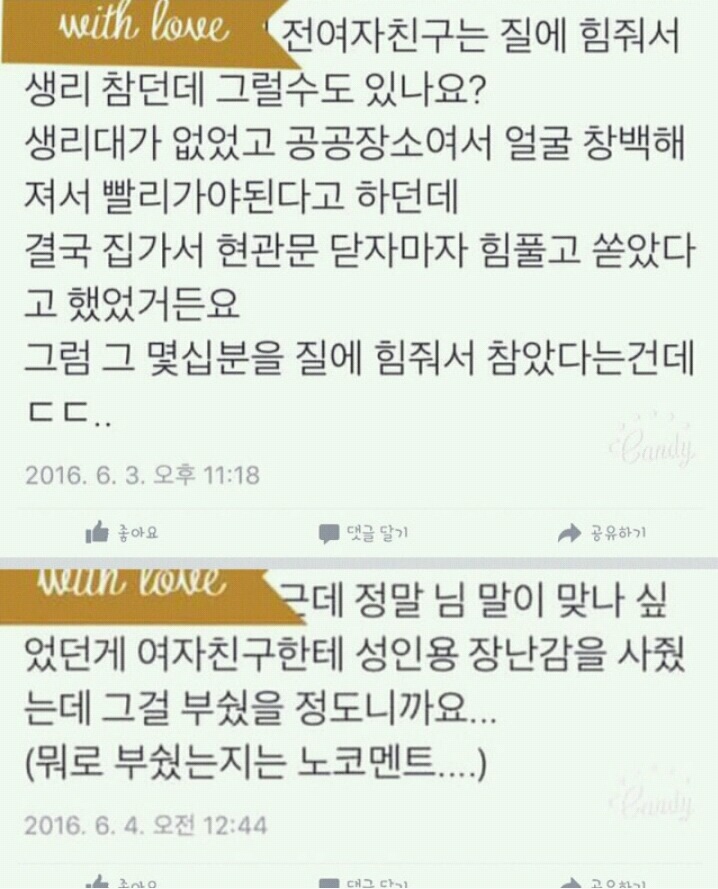 작성자느개비새마을식당김가루도둑 작성시간 18.01.03 여자친구 사겨본남자애들도 잘모르는게 태반임.................그냥 냄져들 그렇게궁금하면 지들이 한번 쳐겪어봣으면 좋겟구만^^.