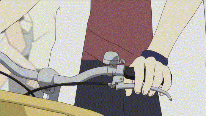 치아키는 끌고 온 자전거의 브레이크를 잡아당겨 보임.
