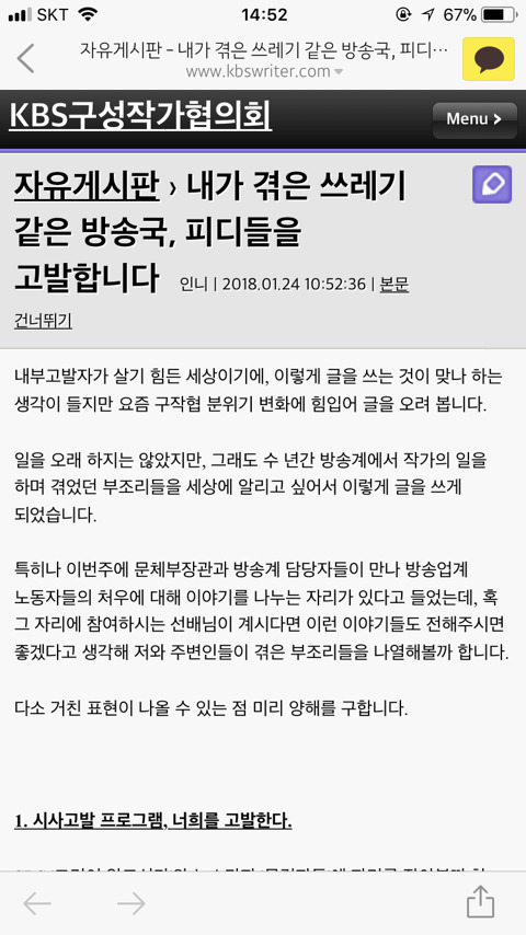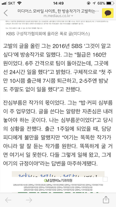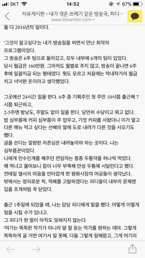 작성자따뜻한겨울, 종현이에게 작성시간 18.01.26 작가뿐만아니라 연출쪽도 만만치 않음 막내 많이 바뀌는팀은 심지어 면접볼 때 잔심부름만 한다고 생각하면된다도 직접 말하는편,,막내 많이 나가서 선배들이 그렇게 시키는 경우도 많고 작가비하 직장비하 절대 아닌데 연출팀은 녹화준비 작가들이랑 같이하고 종편까지 하면서 밤새는일 더 많아 진짜 일할 때 월급의 반은 산부인과랑 내과가는데에 돈 다썼음 진짜 할게못되는 직업