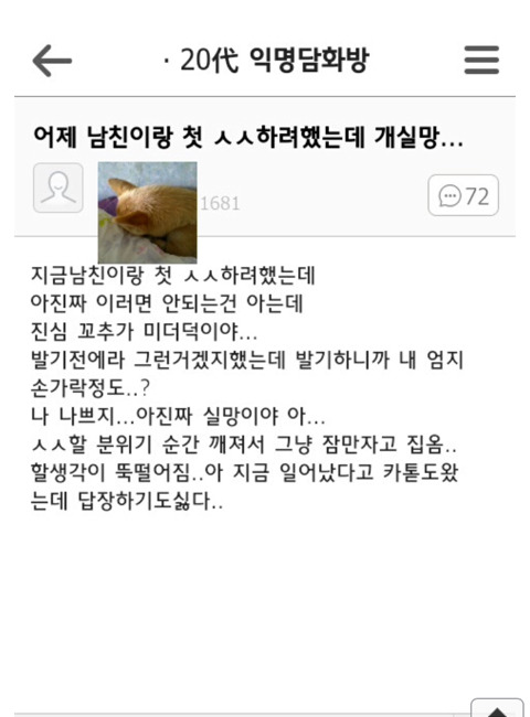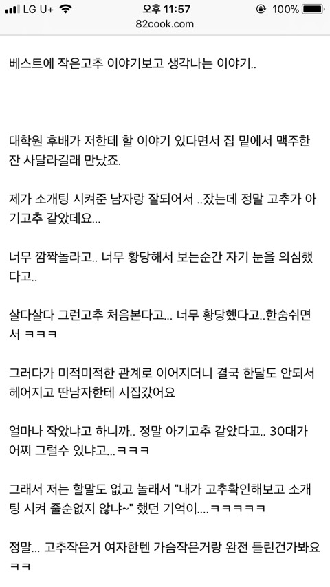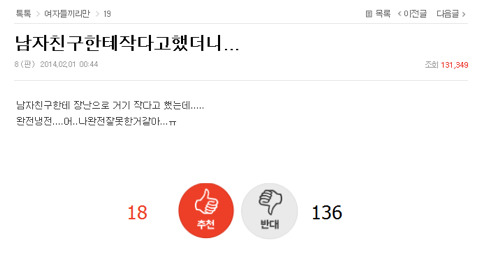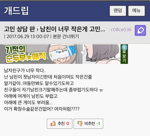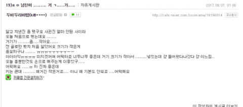 [기타]꼬추 작은 남자와 사귄 여자들의 반응 작성자다시는 만나지 말자|작성시간18.01.30|조회수13,821 목록 댓글 29 글자크기 작게가 글자크기 크게가 출처 익담, 네이트판, 네이버 카페, 개드립문제시 글삭 다음검색 현재 게시글 추가 기능 열기 북마크 공유하기 신고 센터로 신고 댓글 댓글 29 댓글쓰기 답글쓰기 댓글 리스트 작성자동원참치㈜ | 작성시간 18.01.30 작으면 그냥 재기해 작성자그대눈에치얼쓰 | 작성시간 18.01.30 여러분 이쑤시개로 코를 팔수는엄씀미다 삭제된 댓글입니다. 답댓글 작성자솔로2년 | 작성시간 18.01.30 ㄷㄷ 왜죠..? 어릴때 뚱뚱했나 작성자여기사라다한접시요 | 작성시간 18.01.30 아니..,.,,,,.엄지손가락만한게..실제로있어?지금 내엄지 한껏치켜새워서 보는데 믿기지가않는데....그정도면 무슨병아냐? 댓글 전체보기