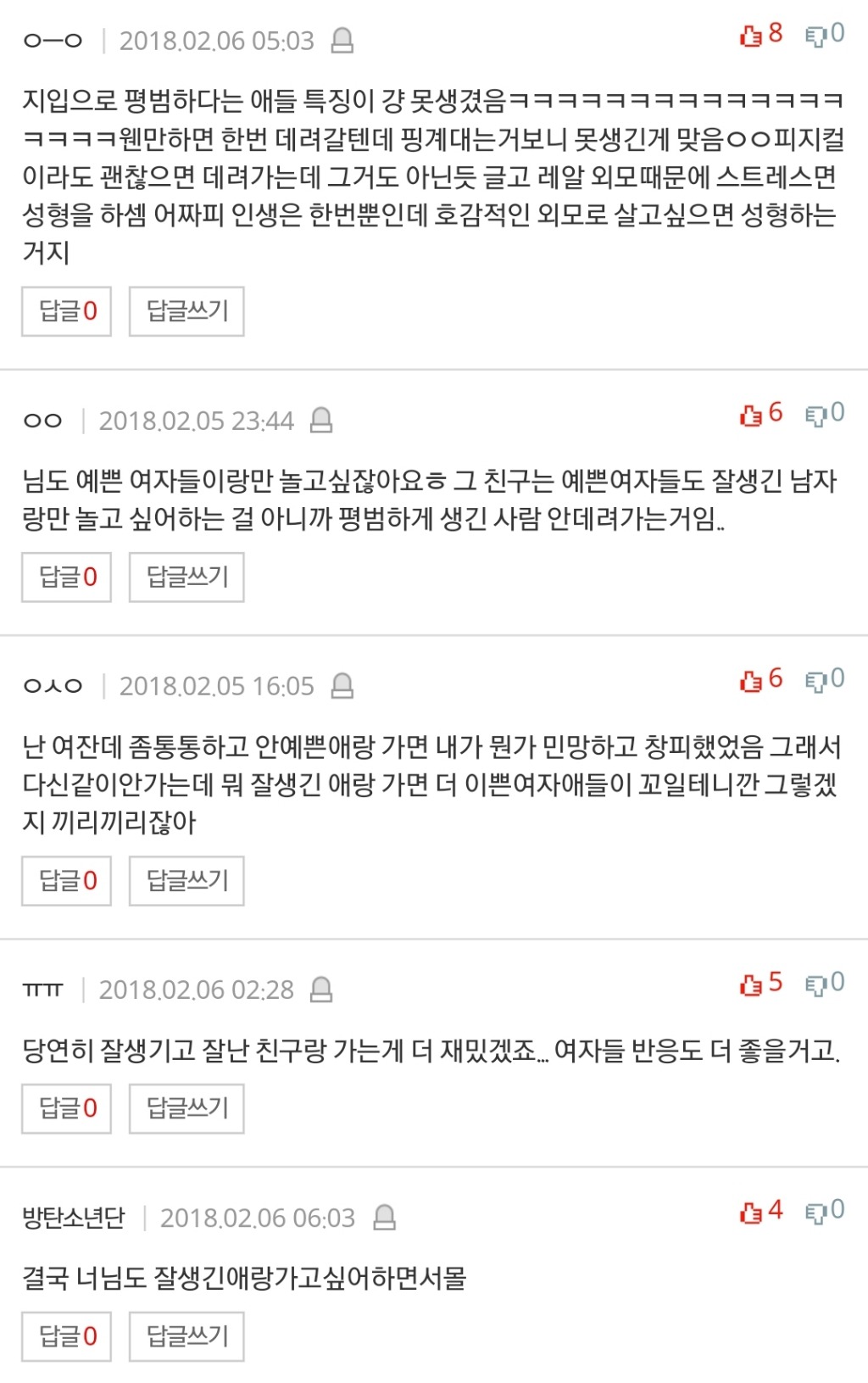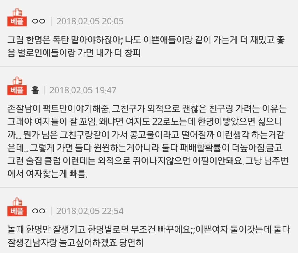 작성자딸기갈아만든배 작성시간 18.02.06 맞아 친구들이랑 맨날하는말이 제발 냄져들 끼리끼리좀 다녀라임.. 2대2에서 3대3으로 인원수 늘어갈수록 확률 더 개개개개희박해짐
