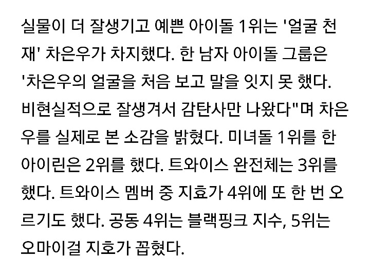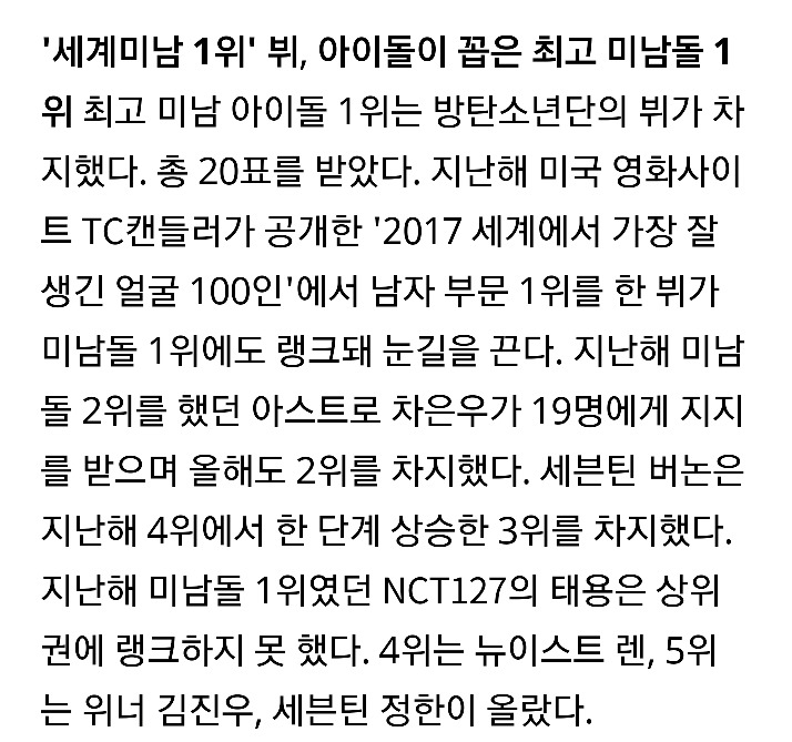 [연뉴][아이돌 100명의 선택①] 뷔·아이린·차은우, 최고 비주얼 톱3 작성자전율미궁|작성시간18.02.15|조회수64,973 목록 댓글 272 글자크기 작게가 글자크기 크게가 http://v.entertain.media.daum.net/v/20180215080034428?f=m&rcmd=re 다음검색 현재 게시글 추가 기능 열기 북마크 공유하기 신고 센터로 신고 댓글 댓글 272 댓글쓰기 답글쓰기 댓글 리스트 작성자디플로쿠스 | 작성시간 18.02.16 은우은우 작성자나 지금 뭐하니 | 작성시간 18.02.16 은우 쩐더 작성자문빈 (1998.01.26) | 작성시간 18.02.16 쩨고야 울 은우 ㅜㅠ 이미지 확대 작성자박지민 없이 사나마나 | 작성시간 18.02.16 태혀아 ㅠㅠㅠ 작성자우리맑겨루기 | 작성시간 18.02.17 (은우는 은우) 댓글 전체보기