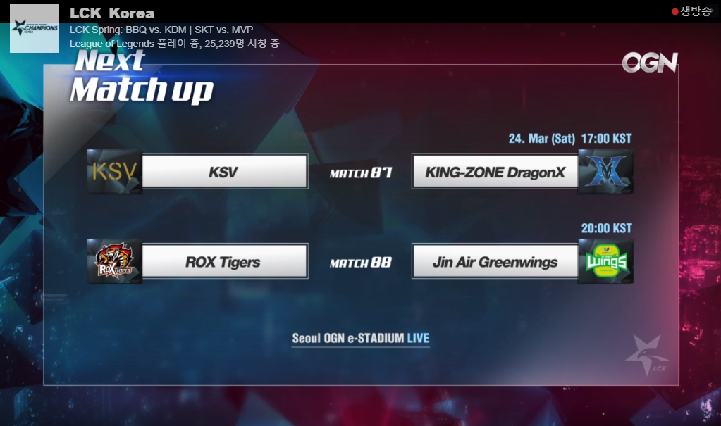 토요일 KSV 와 킹존과의 경기, 락스와 진에어의 경기결과에 따라