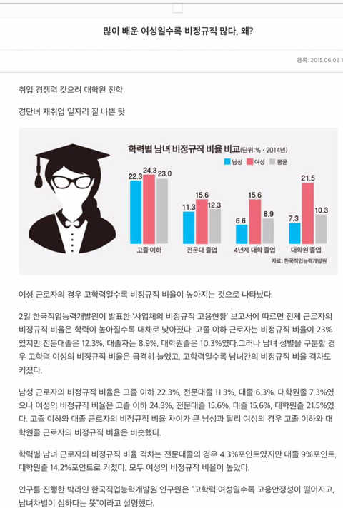 여성은 고학력일수록 비정규직 비율이 높아짐