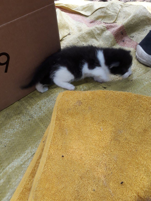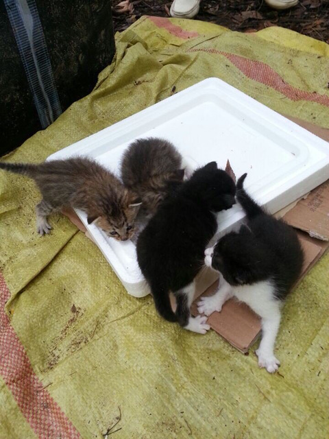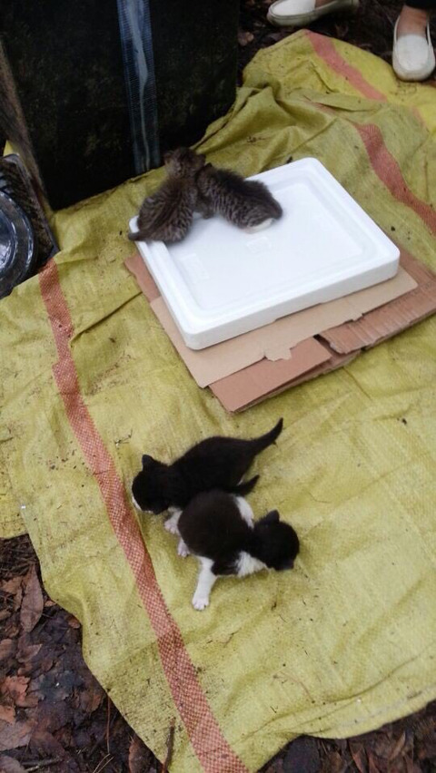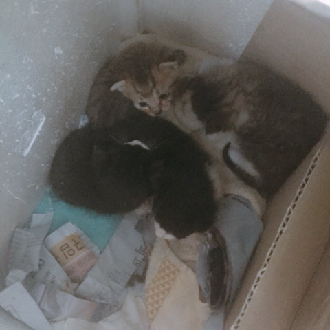 턱시도 두마리 고등어태비 세마리인 재활용통에서 발견된 어린 애기들입니다... 어미도 안 오고 사람도 안 와서 우선 분유 먹이고 다른 상자로 옮기긴 했는데 당장 임보처가 없어서 방치되어있는 상태예요