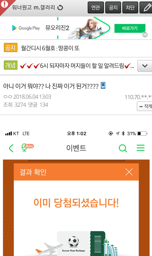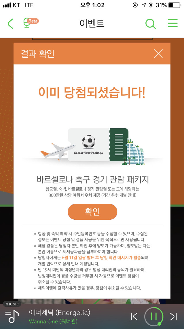 오늘 워너원 음원이 나와서 스트리밍돌릴려고 스밍권 얻기위해 멜론 이벤트 참여한 워너원팬이 1등상품인 바르셀로나 경기 관람권,항공권,숙박권 당첨ㅋㅋㅋㅋ