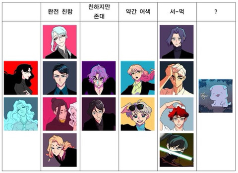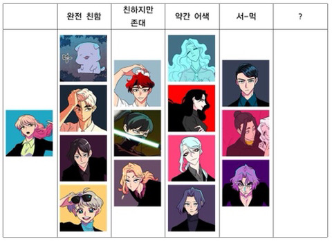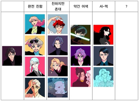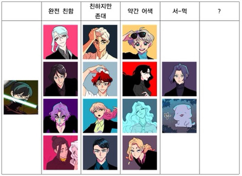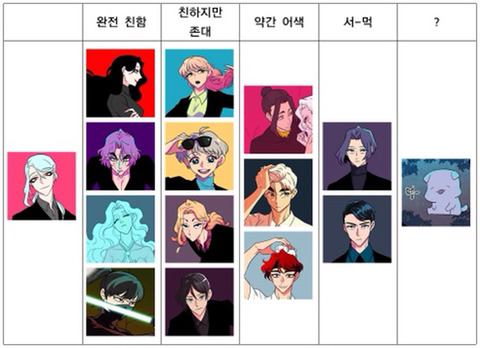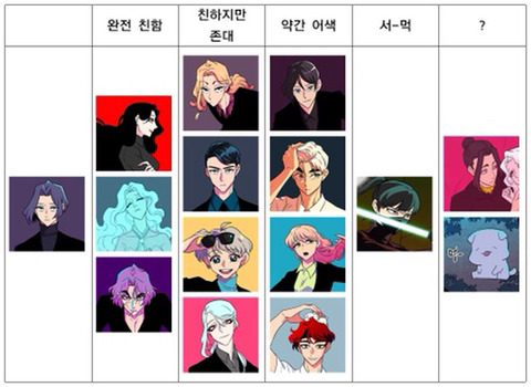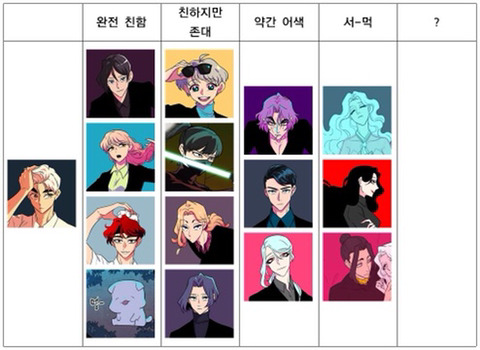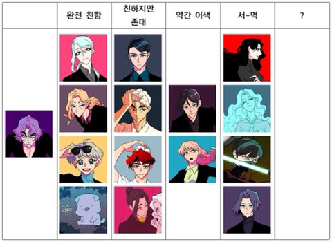 하난 - 백매 춘매 자매와 친하며 암주와도 이전 작품에서 만난 적이 있기 때문에 친함에 넣었다. 신룡은 '알 수 없는 사람'이라 생각하며 어디에도 넣지 않아 개돌이와 함께 ?에 들어갔다.