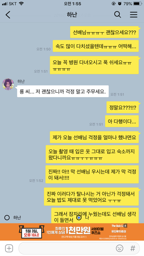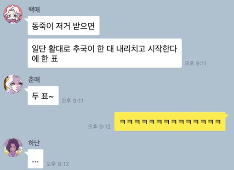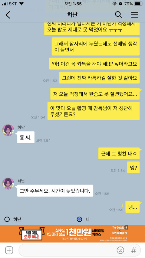 동죽추국 베스트 커플상 후보에 오른 후의 카톡 대화가 공개되었다. 하난이는 이 카톡을 읽고 씹었다.