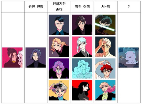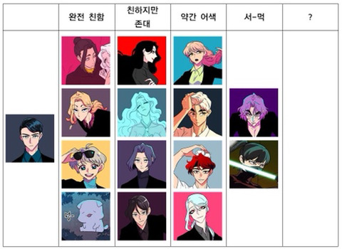 한설 - 설문지를 받자마자 복아를 가장 1순위로 '완전 친함'에 넣었다. 백매, 춘매, 신룡을 서먹에 넣었는데 이유는 대본 리딩 때와 간담회를 제외하고는 아직 함께 촬영장에 있었던 적이 없기 때문이다. (다른 배우들과는 촬영 시간이 겹쳐 한 번 이상씩 만나 봤다.)