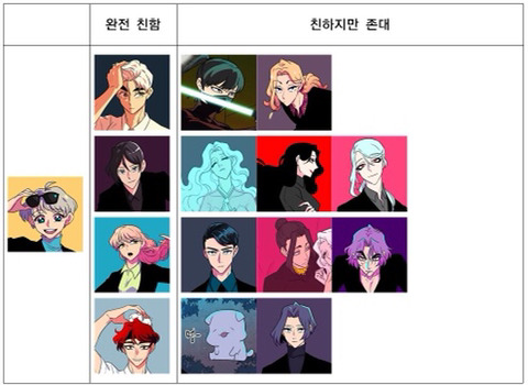 -본 답변은 배우가 직접 준 답변을 기준으로 작성되었으며 쌍방이 아닌 작성자의 일방통행의 관계도입니다. 개돌이에 대한 언급을 하지 않은 사람들은 개돌이가 ? 로 들어갔습니다.-